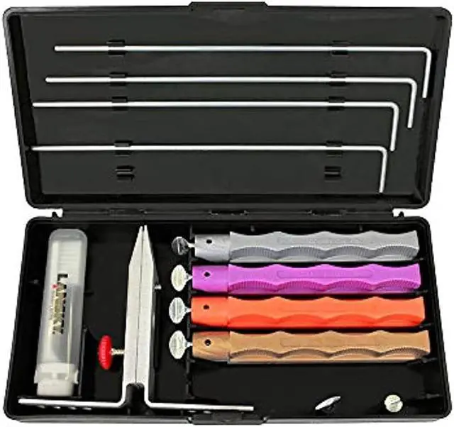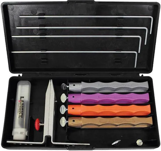 The ultimate in knife sharpening systems technology. It is safe, easy and convenient to use. The Lansky Controlled-Angle Sharpening System is designed to give your blade a professional, razor sharp edge every time. Diamond Kits are very aggressive and are best for quickly setting an edge or resetting the edge to a different angle. Diamonds remove steel much faster than their alumina oxide counterparts. Includes Extra Coarse Diamond (70 grit), Coarse Diamond (120 grit), Medium Diamond (280 grit), and Fine Diamond (600 grit) Hones. Precision-engineered, multi-angle, flip-over knife clamp. Sharpening hones on color-coated, finger-grooved safety holders. One guide rod for each honing stone. Specially formulated honing oil. Custom molded storage/carrying case to hold all system components.