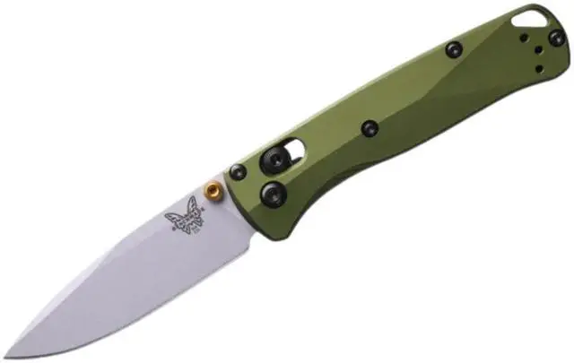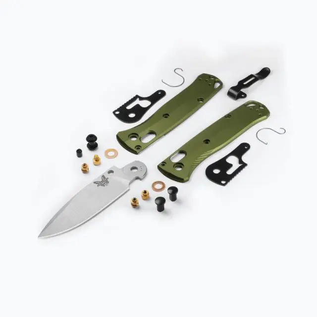 The 533SL-10 Mini Bugout® features earthy, Woodland Green anodized aluminum handle scales, a fresh outdoor hue inspired by the vintage camping gear and cookware you might recognize back at basecamp. With the same slim, ergonomic and compact profile as normal Mini's, we advanced materials beyond the handle, building the 533SL-10 with a premium S90V stainless steel blade with a Crushed Silver Cerakote® finish, and a pop of color, found in its gold anodized thumb stud and barrel spacer.