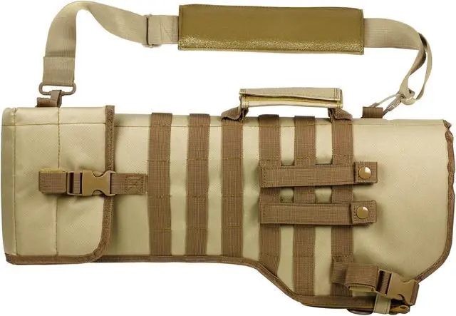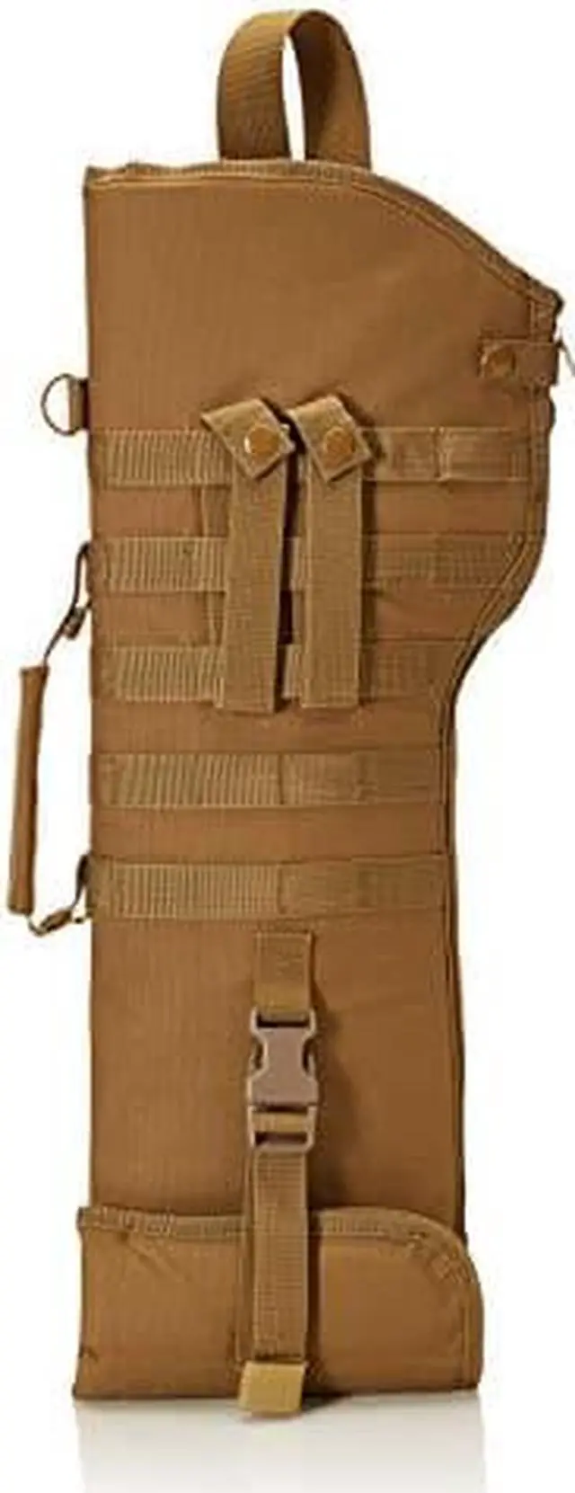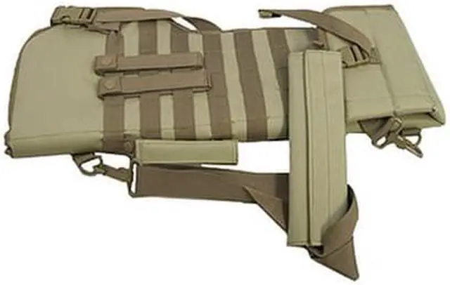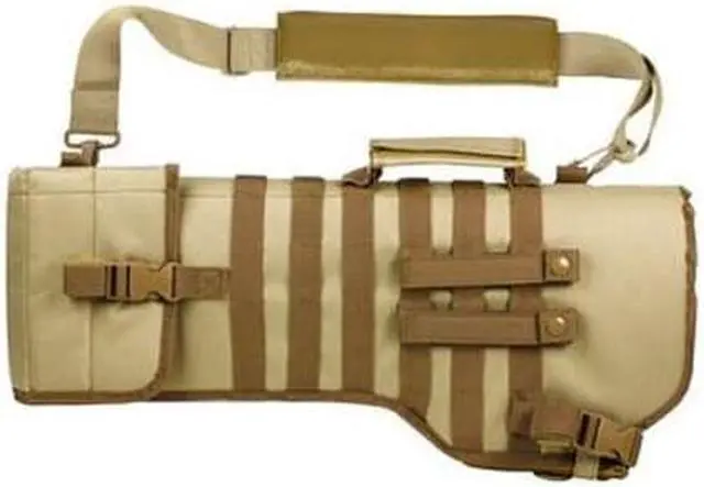The NcStar Tactical Rifle Scabbard is designed for shoulder carry or modular mounting.FeaturesWebbing on both side with four detachable PALS straps for ambidextrous usageSix D-ring locations for attaching the padded shoulder sling to for multiple carry options or preferencesRemovable retention strap with quick-release buckle.Padding around the whole scabbard to protect your rifle