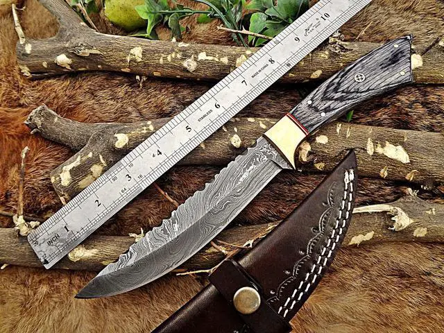11" Long hand forged Damascus steel full tang clip point blade skinning Knife, Dollar wood with Brass bolster scale, Cow Leather sheath