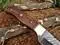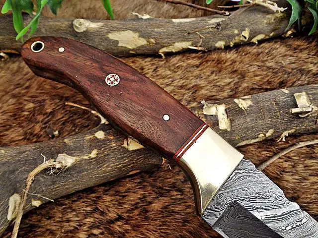 9.5" Long hand forged Damascus steel full tang blade skinning Knife, Natural Rose wood with Brass bolster scale, Cow hide Leather sheath