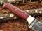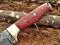 Features: Red Micarta wood scale with Brass bolster 4.5" long Scale is bling with a Mosaic, 2 Brass pins and an inserting hole for extra strength Overall 9" Long with 4" long full tang blade Full tang blades are considered stronger and durable then non full tang Approximately 5 mm Thick Twist pattern Damascus steel drop point blade Up to standard hunting and skinning Knife Comes with a fine quality extra thick and robust leather sheath. The sheath has belt inserting loop and can be worn on belt. Blade is made of Damascus steel by forging the 1095 and 15N20 high and low carbon steel Our Damascus steel is prepared by forging over 465 layer of high carbon and low carbon steel. Blade has been given an excellent heat treatment to get it well hardened Hardness 56 to 58 HRC. If you want more information, OR have queries, please contact us without any hesitation. Tips to