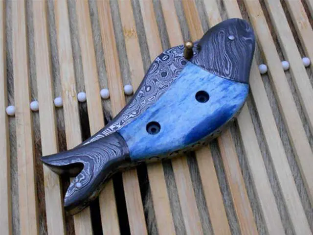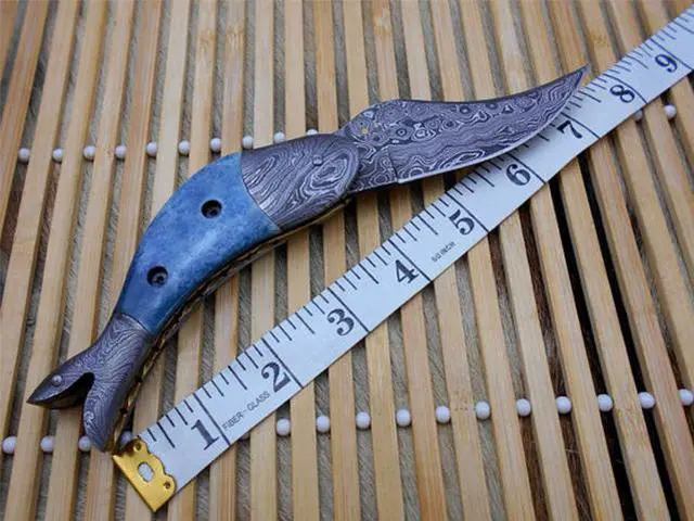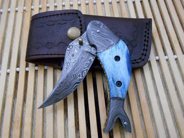 Exotic Colored camel bone scale with Damascus bolster on both edges Overall 8" Long Folding knife with 3.5" long Damascus cutting edge Handle Length is 4 inches Custom made fire pattern Damascus steel Pocket Knife, Camping Knives, Personalized Knife Exotic Fish design Knife Comes with a fine quality extra thick cow hide leather sheath Blade is made of Damascus steel by forging the 1095 and 15N20 high and low carbon steel Blade has been given an excellent heat treatment to get it well hardened Hardness 56 to 58 HRC. Tips to