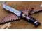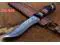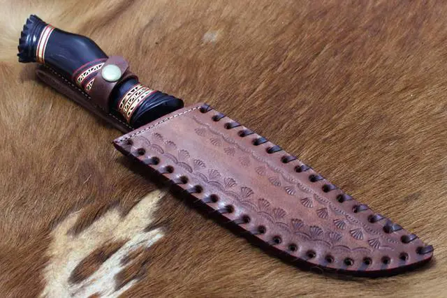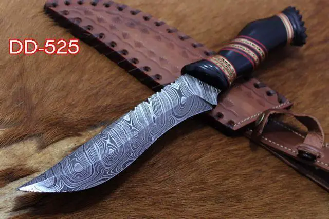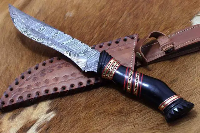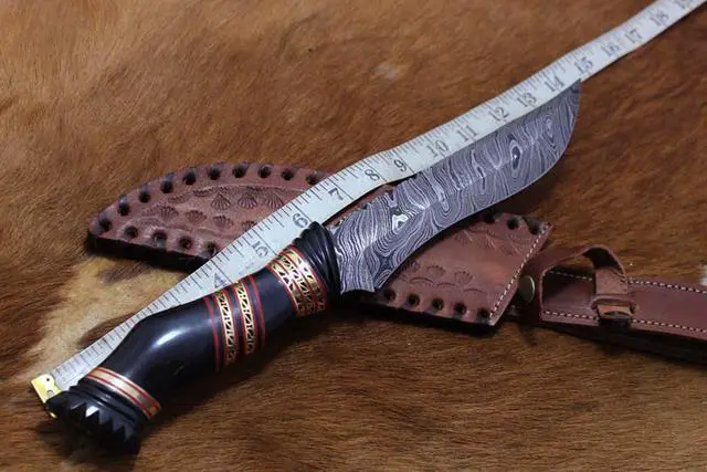 FEATURES: Custom made Engraved Bull horn round scale crafted with engraved brass & Red fiber spacer Overall 13" Long with 7" long hand forged Damascus steel blade with gut hook 5" long cutting edge with clip point blade Approximately 5 mm Thick Twist pattern Damascus steel Handle Length is 6 inches Up to standard hunting knife, Skinning Knife, collectible knife Comes with a fine quality extra thick and robust leather sheath. The sheath has belt inserting loop and can be worn on belt. Blade is made of Damascus steel by forging the 1095 and 15N20 high and low carbon steel Full tang blade goes through all the handle as well in a single piece so full tang blades are durable and stronger than non full tang blades Our Damascus steel is prepared by forging over 465 layer of high carbon and low carbon steel. Blade has been given an excellent heat treatment to get it well hardened Hardness 56 to 58 HRC. Tips to