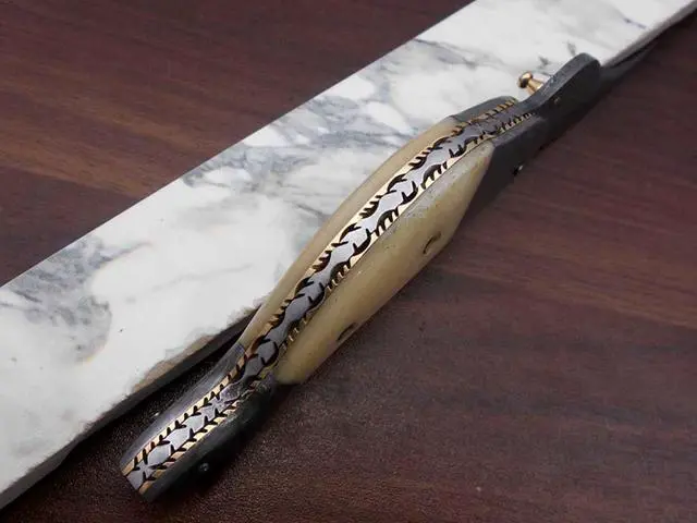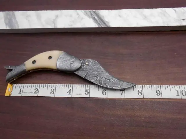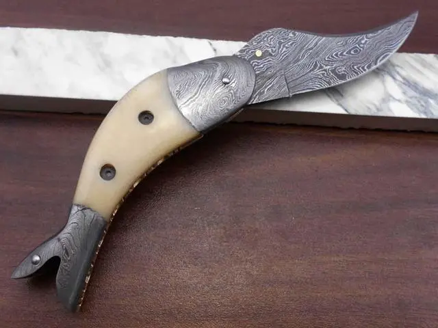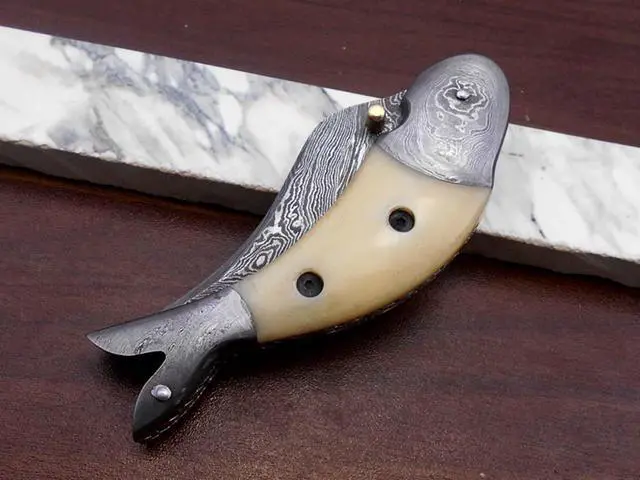 Exotic Colored camel bone scale with Damascus bolster on both edges Overall 8" Long Folding knife with 3.5" long Damascus cutting edge Handle Length is 4 inches Custom made fire pattern Damascus steel Pocket Knife, Camping Knives, Personalized Knife Exotic Fish design Knife Comes with a fine quality extra thick cow hide leather sheath Blade is made of Damascus steel by forging the 1095 and 15N20 high and low carbon steel Blade has been given an excellent heat treatment to get it well hardened Hardness 56 to 58 HRC. Tips to