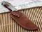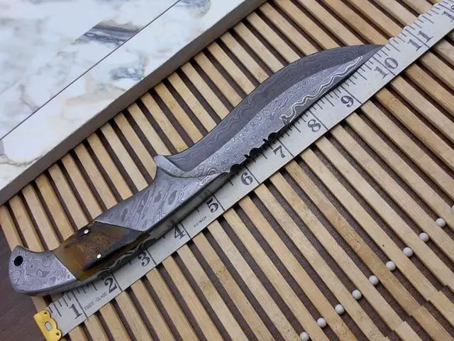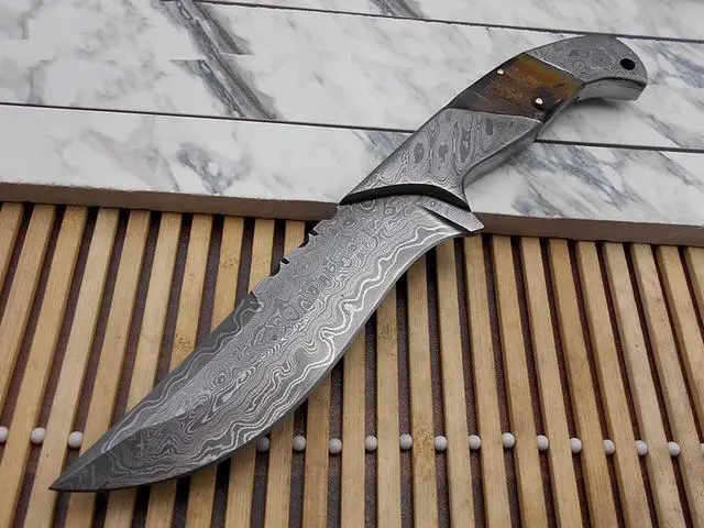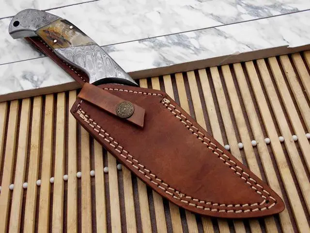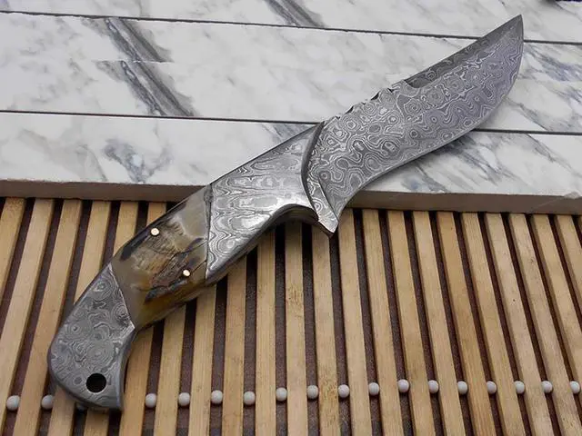 Overall 10.5" Long clip point blade skinning knife. Available in Ram horn, Camel bone and wood scale. 5.5" long hand forged rain drop pattern Damascus steel full tang blade. Approximately 5 mm Thick Twist pattern Damascus steel blade. 5" long full hand Ram horn scale is equipped with solid Pommel & Bolster. Comes with a fine quality extra thick and robust leather sheath. The sheath has belt inserting loop and can be worn on belt. Blade is made of Damascus steel by forging the 1095 and 15N20 high and low carbon steel.
