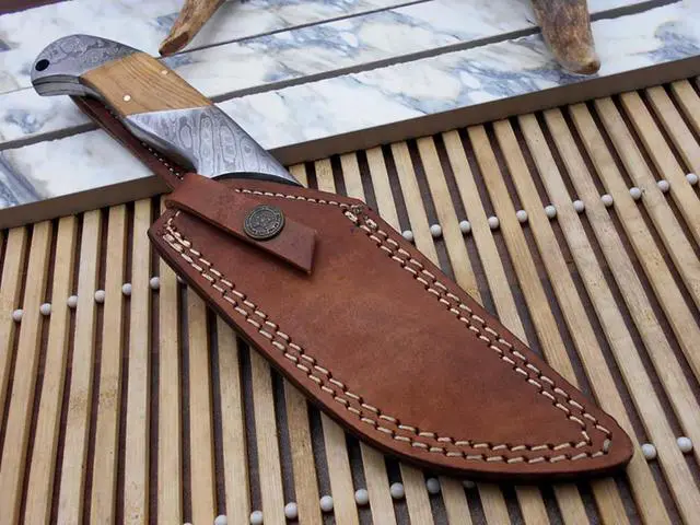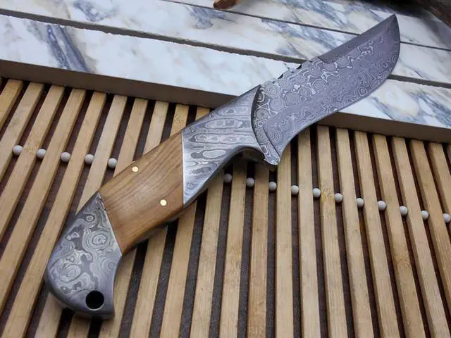 Overall 10.5" Long clip point blade skinning knife. Available in Ram horn, Camel bone and wood scale. 5.5" long hand forged rain drop pattern Damascus steel full tang blade. Approximately 5 mm Thick Twist pattern Damascus steel blade. 5" long full hand Ram horn scale is equipped with solid Pommel & Bolster. Comes with a fine quality extra thick and robust leather sheath. The sheath has belt inserting loop and can be worn on belt. Blade is made of Damascus steel by forging the 1095 and 15N20 high and low carbon steel.