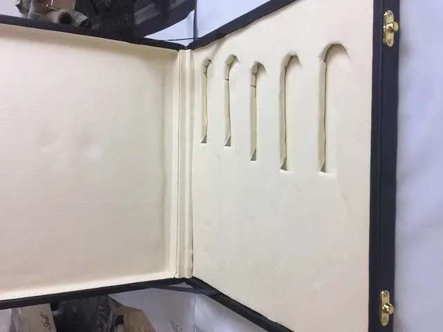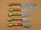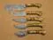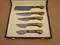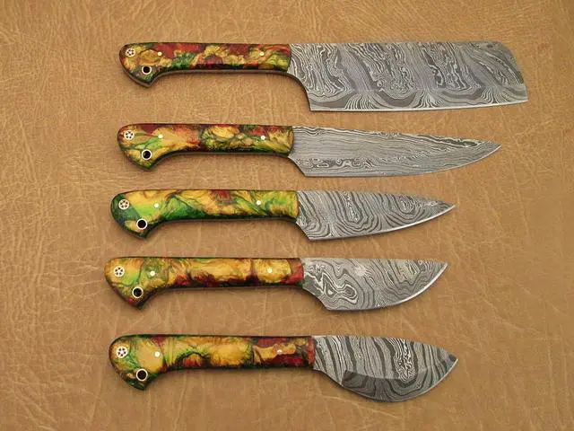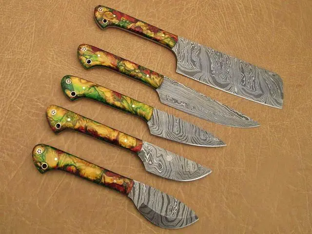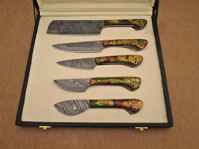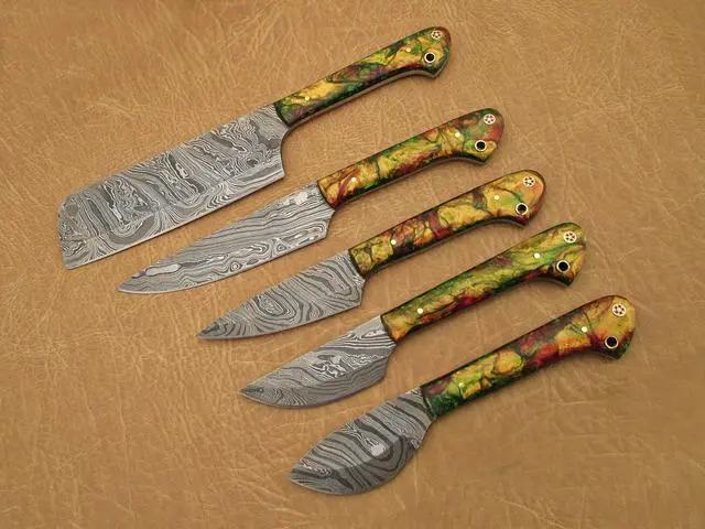 Overall Length of All Set ( 10.6 + 9.6 + 9.0 + 8.0 + 7.6 )Inches (approximately) " Long with ( 6.10 + 5.5 + 5.0 + 4.0 + 3.10 )inches (approximately) full tang blade Exotic natural Buffalo horn Scale with solid brass bolster. ( 4.5 + 4.1 + 4.0 + 4.0 + 4.5 )inches (approximately) inches long Handle, Fabulous handle material. Blade is made of Damascus steel by forging the 1095 and 15N20 high and low carbon steel Blade has been given an excellent heat treatment to get it well hardened Hardness 56 to 58 HRC.
