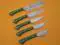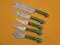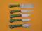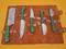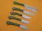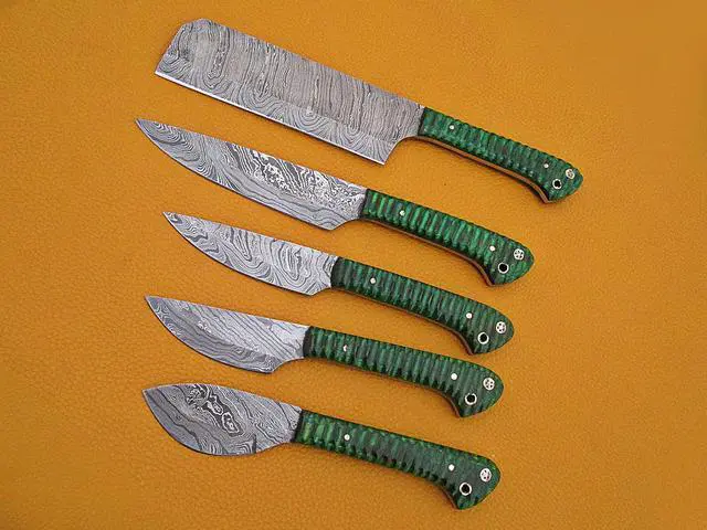 Overall Length of All Set ( 10.6 + 9.6 + 9.0 + 8.0 + 7.6 )Inches (approximately) " Long with ( 6.10 + 5.5 + 5.0 + 4.0 + 3.10 )inches (approximately) full tang blade Exotic natural Buffalo horn Scale with solid brass bolster. ( 4.5 + 4.1 + 4.0 + 4.0 + 4.5 )inches (approximately) inches long Handle, Fabulous handle material. Blade is made of Damascus steel by forging the 1095 and 15N20 high and low carbon steel Blade has been given an excellent heat treatment to get it well hardened Hardness 56 to 58 HRC.