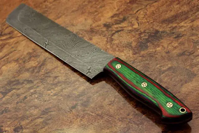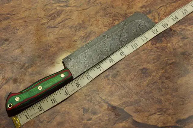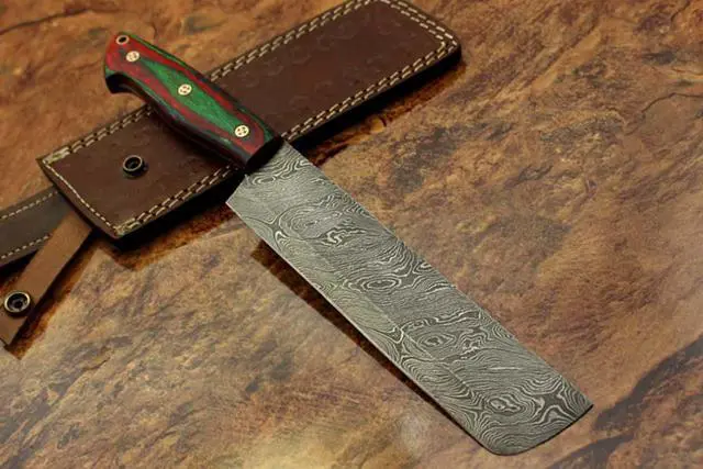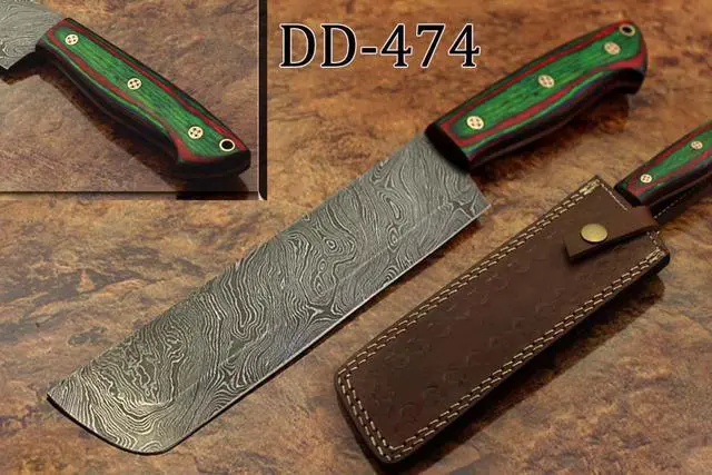 12.5" hand forged Damascus steel Nakiri knife, kitchen knife, vegetable knife, 2 tone Green & Maroon wood scale, Cow hide Leather sheath with belt loop