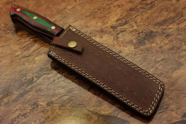 Damascus steel as well as 1095 high carbon steel knives are different than some other common steel knives, because of its high carbon content they can be rusted if not care properly. If you have seen rust accidentally then use WD40 to remove it Never store your knife for long time in leather sheath. Leather can absorb water which will rust the knife. Always clean the blade after using and apply oil or wax (please use cooking oil on Chef Knife) before you store it, for its longer life and durability.