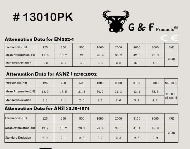 - Attenuation measurements have been performed according to the American National Standards Institute (ANSI) Specifications, ANSI 3.19-1974, using the experimenter-fit protocol, on the G&F Products Model 12010/BL, 12010/BU earmuff (test ID Q3991A). The specified threshold measurement data were obtained using ten normally-hearing listeners, six male, and four female. These listeners were selected from a standby group of about 35 volunteers who regularly serve as listeners for measurements of this kind.
