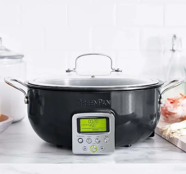 Like a magic cooking pot, the Electric Essential Smart Skillet from GreenPan cooks up a storm from stir-fries to sauces, soups and rice. The pioneering company behind PFAS-free healthy ceramic nonstick cookware presents its latest Thermolon Volt healthy ceramic nonstick coating featured on the interior of the inner pan to ensure perfect cooking results and easy cleanup every time. With a range of temperatures from the ultrahot Sear/Saut to the gentle heat of Warm, use it to help with a multitude of cooking tasks. Ten preset functions combine time and temperature for the best results.