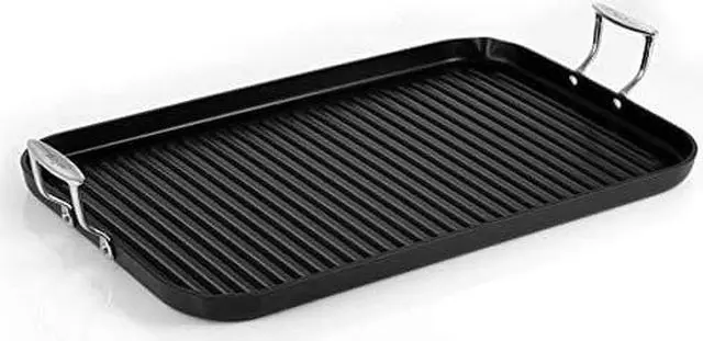 Features: - Heavy gauge Aluminum Body with Hard Anodized Surface for Even Heating - High Ridges Drain Excess Fats - creates Perfectly Seared grill Marks - gas, ceramic, glass, and Halogen cooktops compatible - Superior Nonstick Interior Allows for cooking without Frustrating Stuck-on Messes - Designed for comfortable grip - Help Stay cool during cooking - Needs Two Burner when Using - Dishwasher Safe, Hand washing is Recommended -