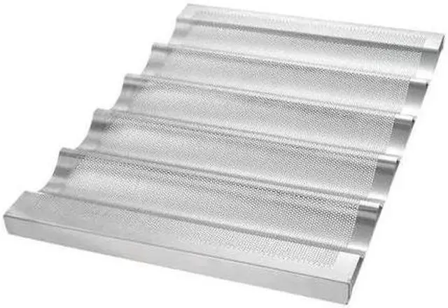 Baguette/French Bread Pan, Gauge 16 ga, Material Aluminum, Dishwasher Safe No, Freezer Safe No, Oven Safe Yes, Color Silver, Overall Length 25 3/4 in, Overall Width 17 3/4 in, Overall Depth 1 in, NSF Certified No, Number of Slots 5, Pan Style Baguette/French Bread Pan
