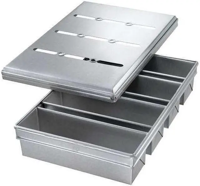 Pullman Bread Pan, Gauge 26 ga, Material Aluminized Steel, Dishwasher Safe No, Freezer Safe No, Oven Safe Yes, Color Silver, Overall Length 21 3/8 in, Overall Width 13 3/4 in, Overall Depth 4 in, NSF Certified No, Number of Slots 4, Pan Style Pullman Bread Pan. This item has been restricted from sale in the following state (s): []