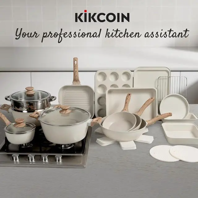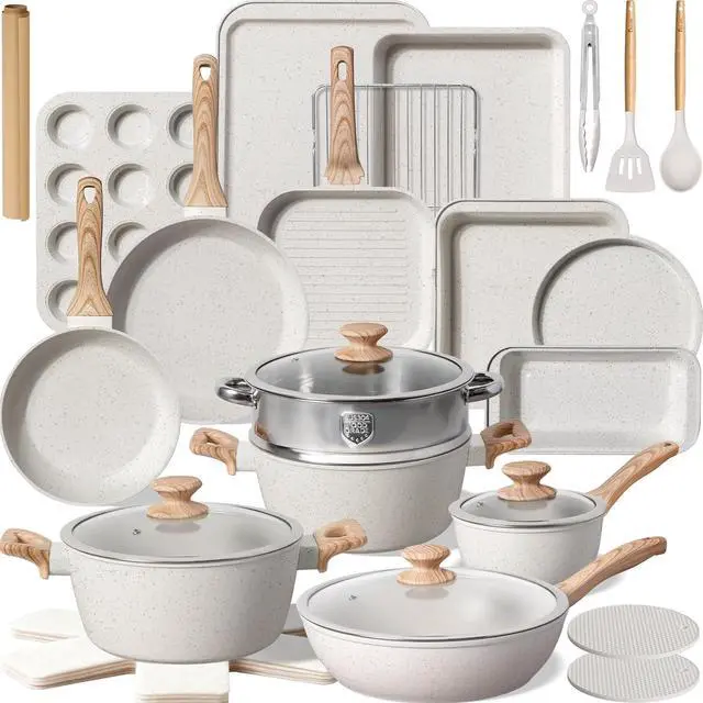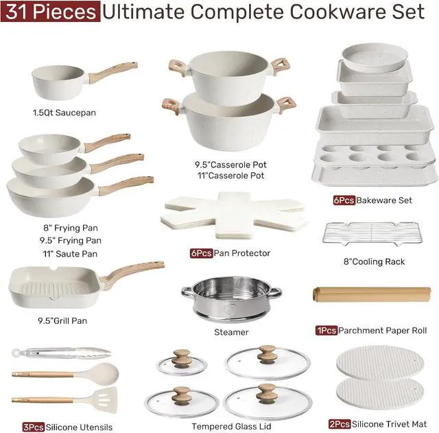 Complete Kitchen Cookware Set31-Piece Cookware Set Includes 8" Frying Pan, 9.5" Frying Pan, 11" Saute Pan with Lid, 1.5Qt Saucepan with Lid, 9.5"Casserole Pot with Lid and Steamer, 11"Casserole Pot with Lid, 9.5"Grill Pan, 3Pcs Silicone Utensils, 6Pcs Bakeware Set, 8"Cooling Rack, 2Pcs Silicone Trivet Mat, 6Pcs Pan Protector, 1Pcs Parchment Paper Roll. Stock your kitchen with this versatile 31-piece cookware set and have everything on hand to create memorable meals you'll love