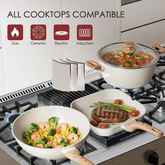 Compatible with All StovesOur pots and pans set are suitable for gas, induction, ceramic, or electric stoves, and compatible with any type of stove. Tempered glass lids lock in moisture and allow you to monitor your cooking without releasing heat or steam