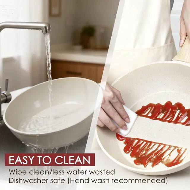 Easy to MaintainAfter cooking and food preparation, simply clean with warm water and a soft sponge or cloth, reducing water waste. The cookware is also dishwasher-safe for quick cleaning, though handwashing is recommended to extend its lifespan