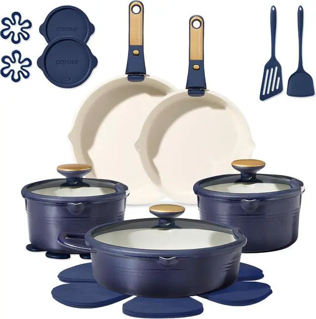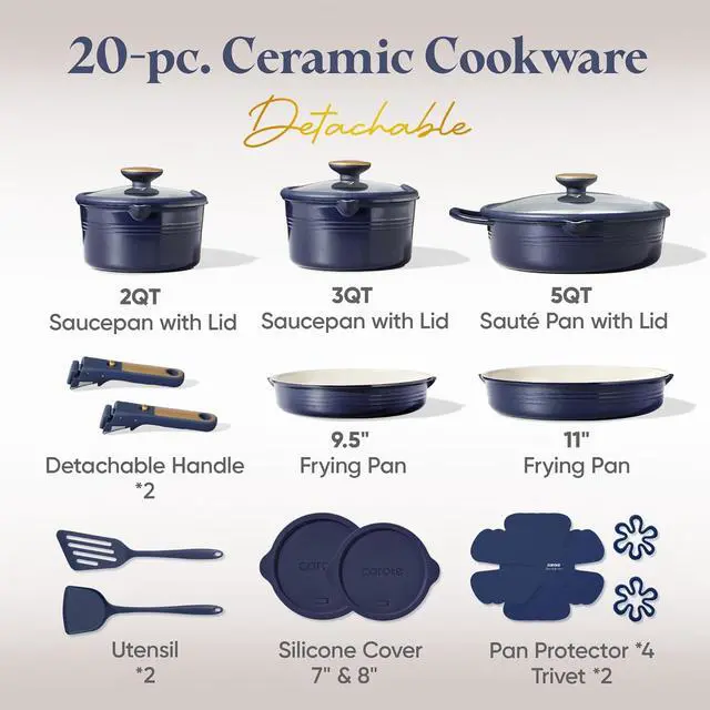 CAROTE 20Pcs Titanium Cookware Set, Pots and Pans Set Non Stick, Kitchen Cooking Set with Detachable Handle, Non Toxic Induction Cookware, Dishwasher/Oven Safe,Blue