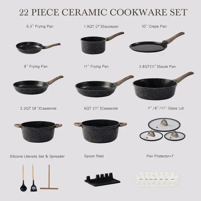 • COMPLETE SET: 22-Piece Cookware Set Includes frying pans (6.3, 8, 11), saucepans (1.9QT, 3.8QT), casseroles (2.3QT, 6QT), 10 Crape Pan, glass lids, silicone utensils, spoon rest & 7 pan protectors.