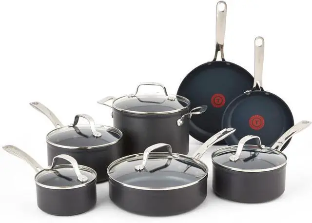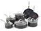 Set includes: 8" fry pan, 10" fry pan, 1 qt; Saucepan with lid, 2 qt; Saucepan with lid, 3 qt; Saucepan with lid, 5 qt; Dutch oven with lid, solid spoon, slotted spatula