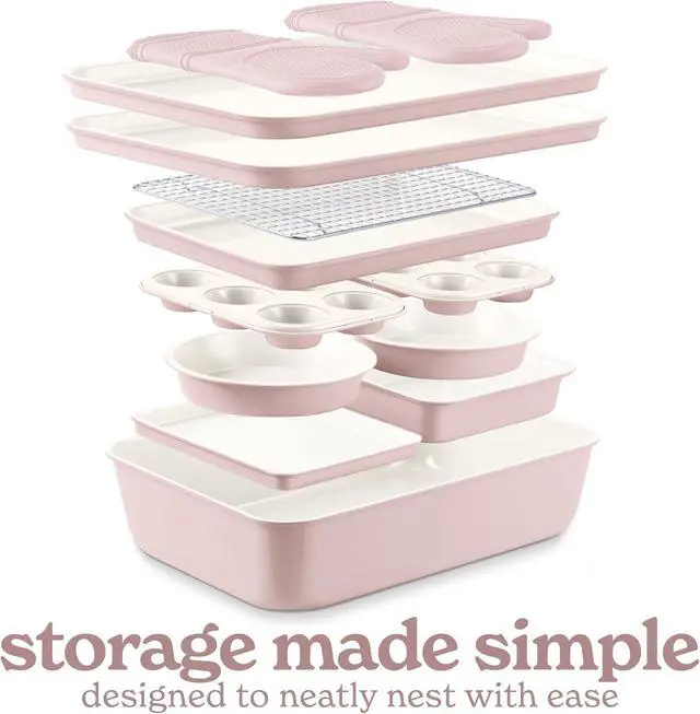 Professional 13-Piece Set This all-in-one bakeware collection includes cookie sheets, cake pans, a cooling rack, and durable oven mitts, providing everything you need for baking and cooking like a pro.