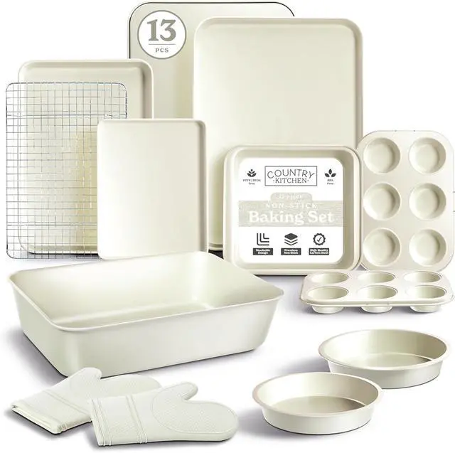 Professional 13-Piece Set This all-in-one bakeware collection includes cookie sheets, cake pans, a cooling rack, and durable oven mitts, providing everything you need for baking and cooking like a pro.