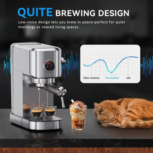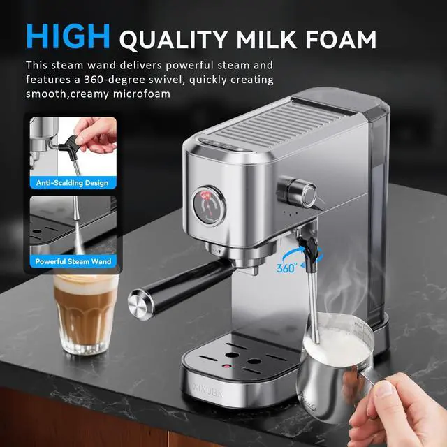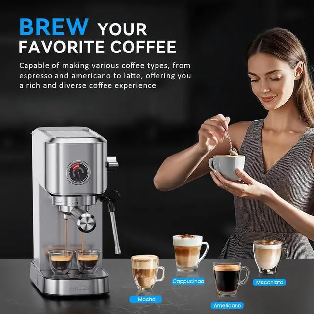Make Your Favorite Espresso Coffee: XIXUBX semi automatic espresso machine is equipped with a powerful steam frother and instant heating system for fast extraction and silky milk foam. The compact and durable stainless steel design saves space and fits in any size kitchen, home or office. You can enjoy latte, cappuccino, macchiato or iced coffee at home