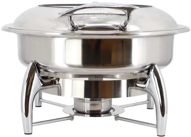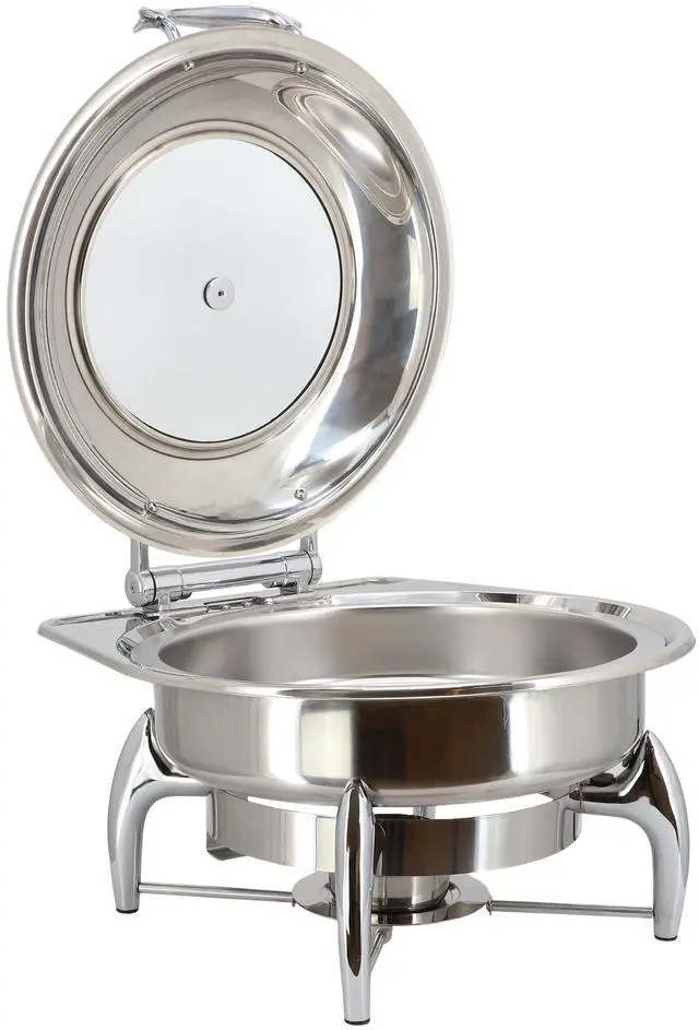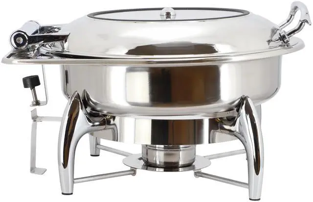 Serve your culinary creations with flair using the MegaChef 6.3 Quart Stainless Steel Round Chafing Dish with Frame. This elegant chafing dish is perfect for keeping your food warm during gatherings, buffets, or catered events. Constructed from high-quality stainless steel, it not only boasts durability but also offers a sleek, polished finish that complements any dining setup. The spacious 6-liter capacity ensures you have ample space for a variety of dishes, and a see-through viewing window allows for guests to easily see what's inside.