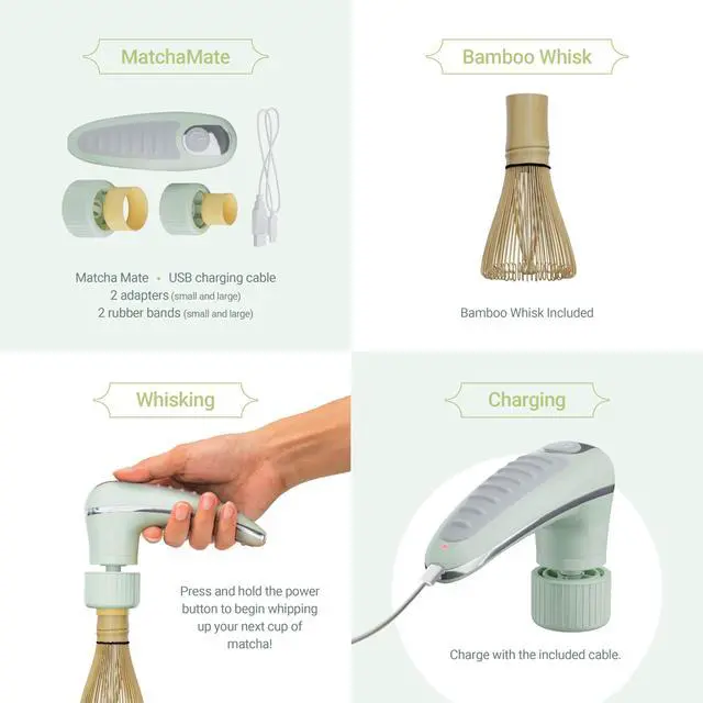 COMPLETE MATCHA SET: Includes the electric Matcha Mate, traditional bamboo matcha whisk, two adapters (small & large), rubber fitting bands, and charging cable.