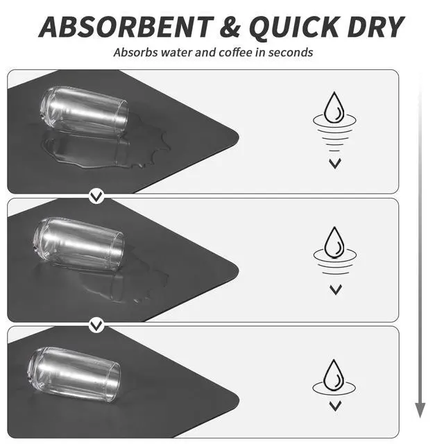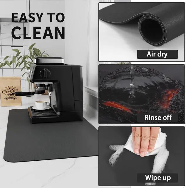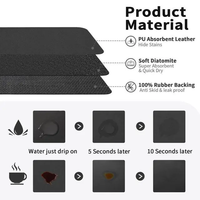 The dish drying mat is made of highly absorbent nano-leather material with a natural rubber backing. The rubber backing helps keep countertops dry while absorbing large amounts of water quickly.