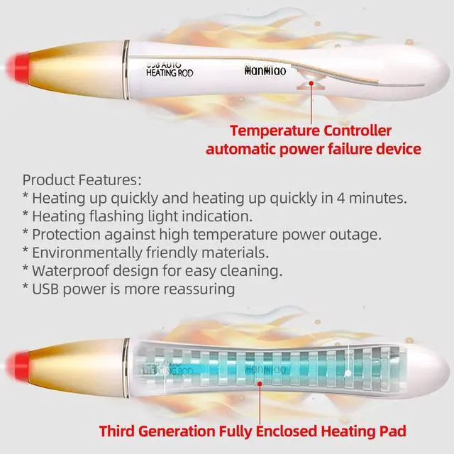 1. USB Heating Rod, waterproof and compact design. Quickly warms toysfeel warmth in just 2 minutes, reaching 113°F (45°C) within 4 minutes. After heating, temperatures typically settle within the comfortable range of 95 to 113°F (37 to 45°C), close to body temperature without overheating. Significantly saves your time.
