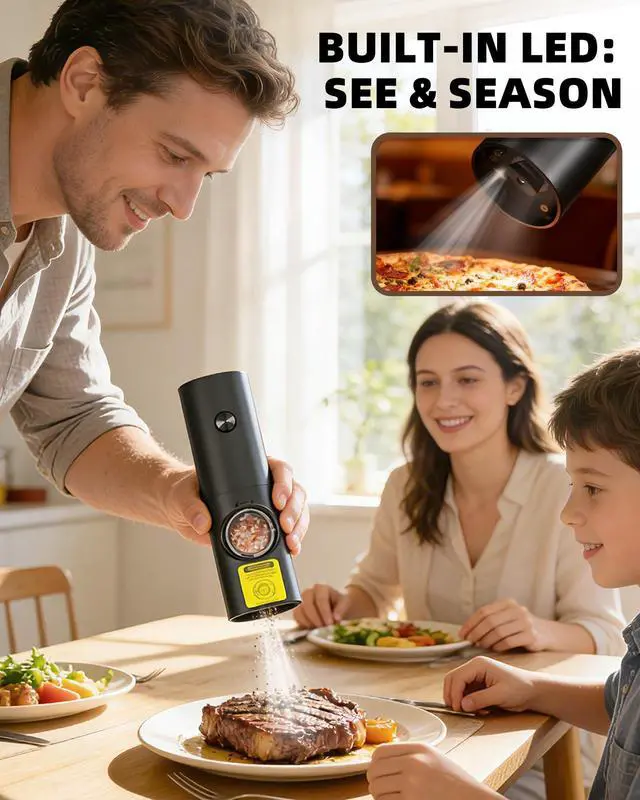 • BUILT-IN ILLUMINATING LIGHT: The integrated light ensures accurate seasoning in low-light settings, whether at a cozy dinner or an evening barbecue. A functional and elegant choice as a Christmas gift for dad or a birthday surprise for men who enjoy cooking.