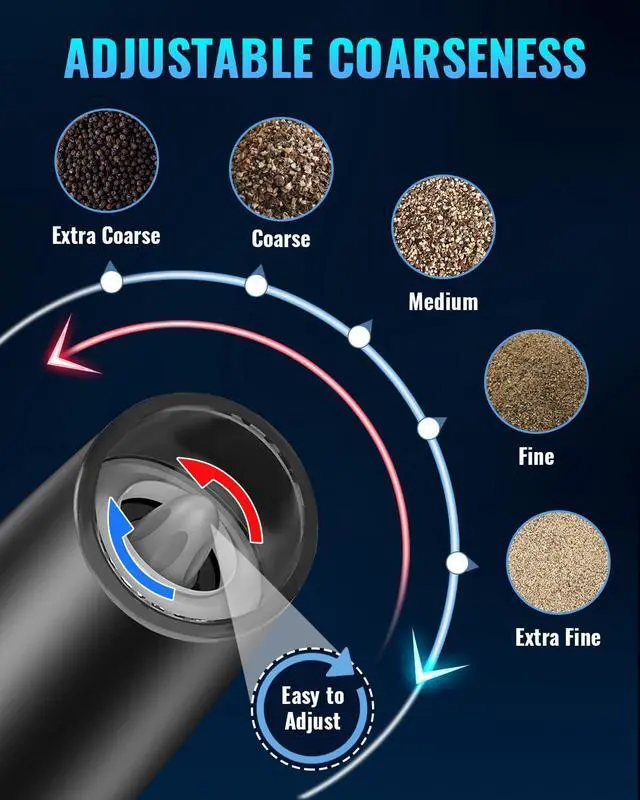 Unique DesignTransparent acrylic material(BPA-FREE) at the bottom allows you to see the remaining spices and convenient to distinguish the spices in the grinder. With the blue LED light, blue light is not only bright but also gentle, you can easily to see amount of pepper, salt and other grain you put in your food.