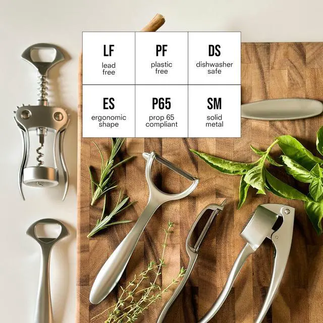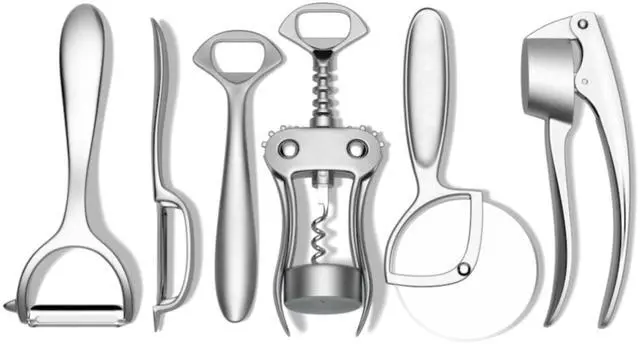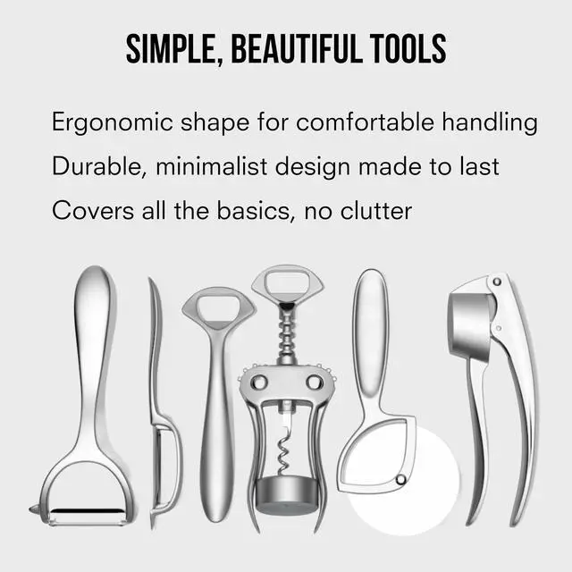 This 6 piece kitchen tools set covers all your everyday prep with durable, ergonomic essentials made from solid, lead-free metalno plastic, no excess. Each piece is thoughtfully designed to feel balanced in the hand and built to last, with a timeless, matte finish that blends seamlessly into any kitchen setup. From peeling and slicing to opening bottles and pressing garlic, these tools do their job simply and beautifullyand theyre dishwasher safe for easy cleanup.