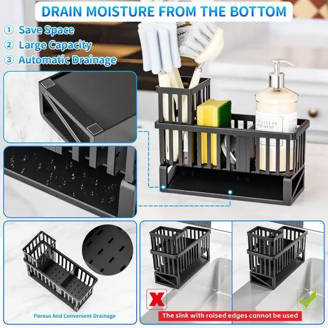 Large Capacity/Space SavingOur sink sponge holder Can holds 2 detergent bottles, a dish sponge,a dish brush,a dish soap,a scrubber and sink stopper at the same time. With an extra upgraded brush holder that can hold up to 4 small and large sized brushes, with the Our sink sponge holder you can save countertop space perfectly