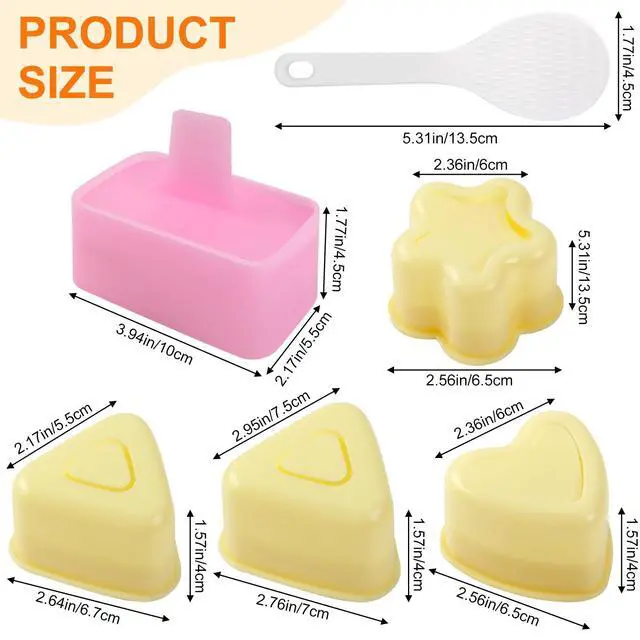 Product Details: You will receive a set of 6pcs onigiri mold, comprising 5 different shapes (1 large triangle, 1 small triangle, 1 square, 1 heart, and 1 plum blossom) along with 1 rice scoop