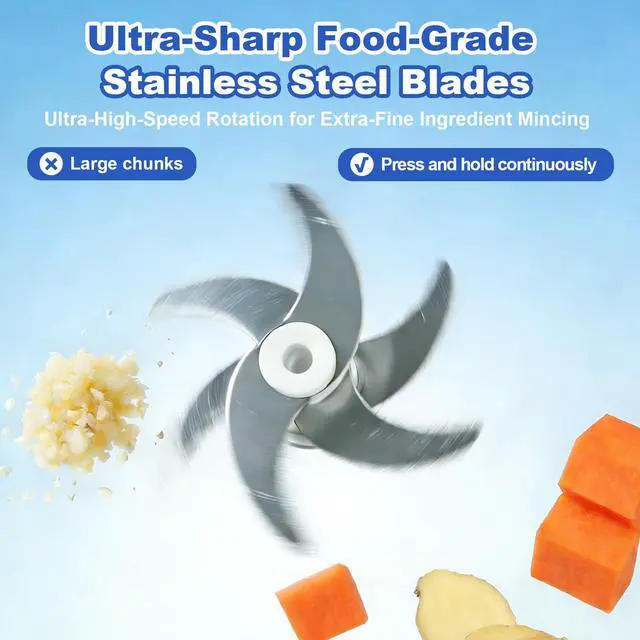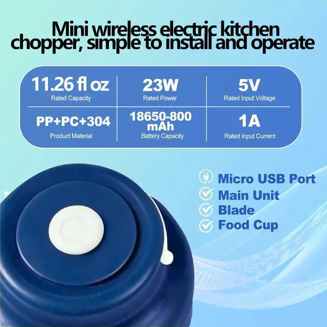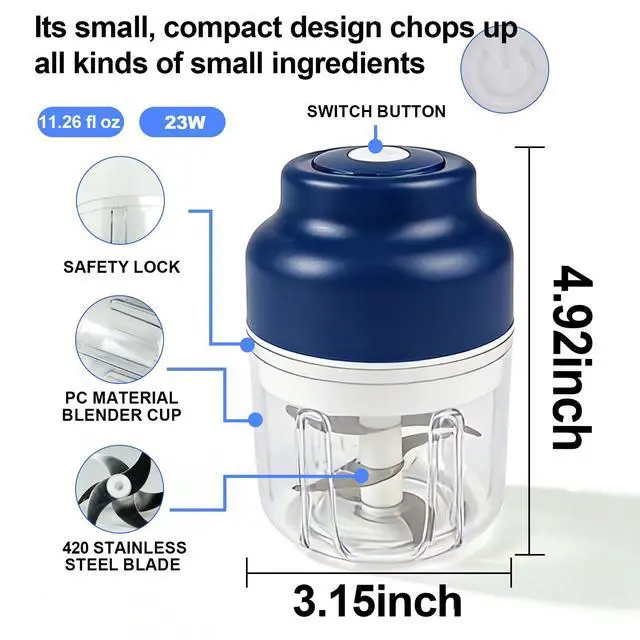 Say goodbye to tedious manual chopping and welcome a smarter, more efficient kitchen experience! Our Wireless Auto-Stir Food Chopper combines powerful performance with convenient design, making food prep easier than ever. Whether you're creating delicious sauces, preparing nutritious baby food, or quickly chopping herbs and vegetables, it's your ideal kitchen companion. Enjoy the freedom of cordless operation and the simplicity of one-touch control to redefine your cooking routine. Capacity: 11.26oz Power Source: Built-in Rechargeable Lithium Battery (USB Charging Cable Included) Material: Food-Grade PC Cup & Stainless Steel Blades Functions: Chopping, Mixing, Blending, Pureeing Features: Cordless Operation, Auto Stirring, Easy Cleaning