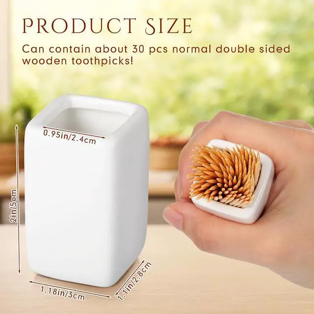 Suitable Size for Convenience: our white ceramic toothpick holder touts a well thought out size of approximately 1.2 x 1.2 x 2 inches/ 3 x 3 x 5 cm, can hold 35 toothpicks; This compact sizing is both stylish and practical, fitting easily on any surface without taking up unnecessary space; Note, the product does not contain toothpicks