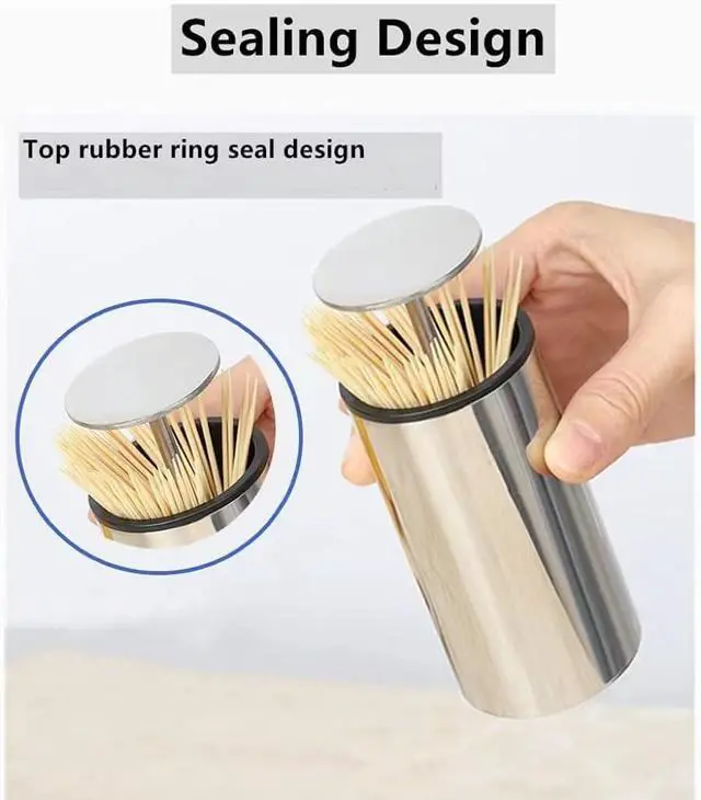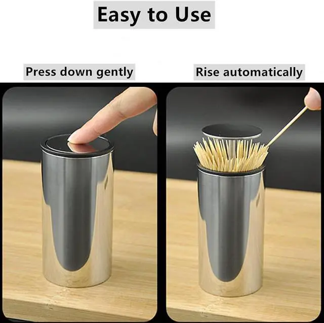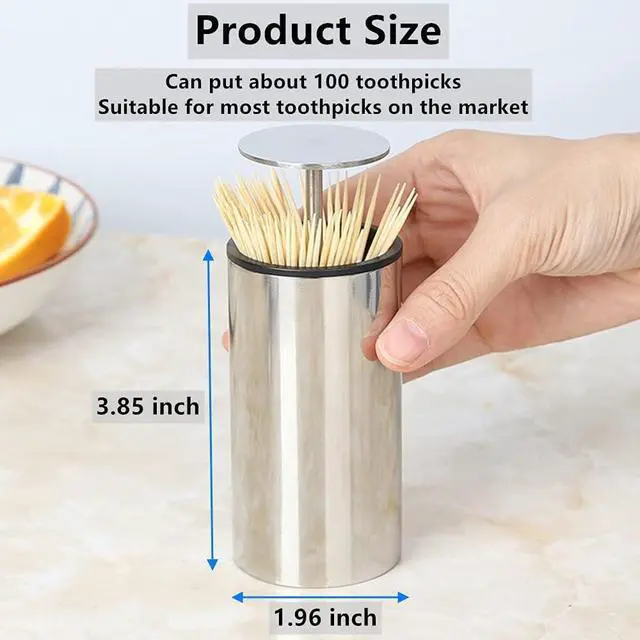 Specification:1Package Included: 1 Stainless steel toothpick holder ( Does not contain toothpicks )2Material: stainless steel + PP liner3Size: 1.96 x 3.85inchCan put about 100 toothpicksIt can store toothpicks up to 2.56 inches in length and is suitable for most toothpicks on the market.Features:1Easy & Fun to use Gently press the top of the toothpick holder, the toothpick cover automatically pops out, presses freely, and is durable.2Seal design: Sealed design, convenient access, safe and healthy.3Portable & Decorative: This pocket size toothpicks dispenser can hold large number of toothpicks. It is also very cute, funny and decorative. BETTER LIFE Surprise your family and friends with this automatic toothpick dispenser