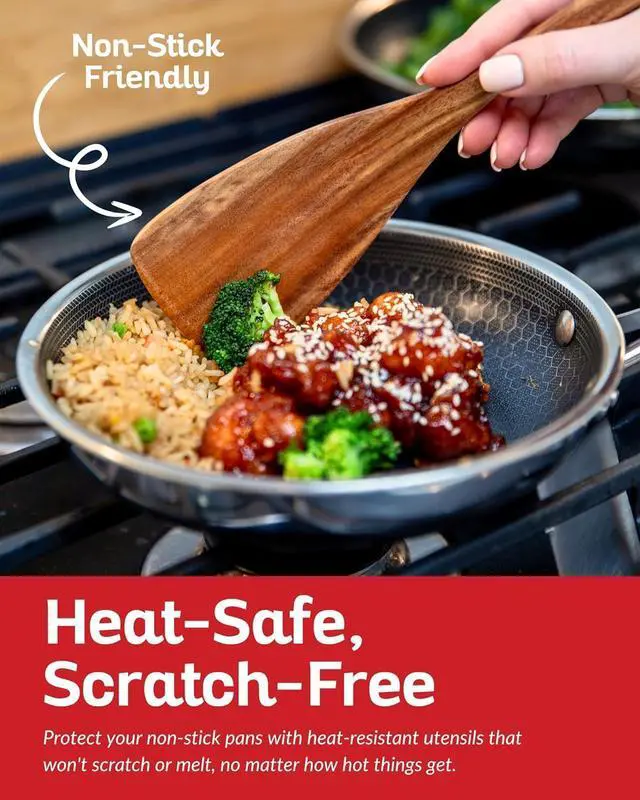 WOOD COOKING SPOONS FOR NONSTICK COOKWARE: The wood kitchen utensils set is suitable for non-stick cookware. The best cooking utensil material won' t scratch or damage your favorite non-stick cookware! You can also use these utensils for high-heat sauteing, baking, mixing, flipping, and serving