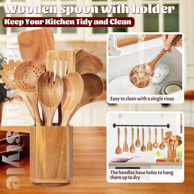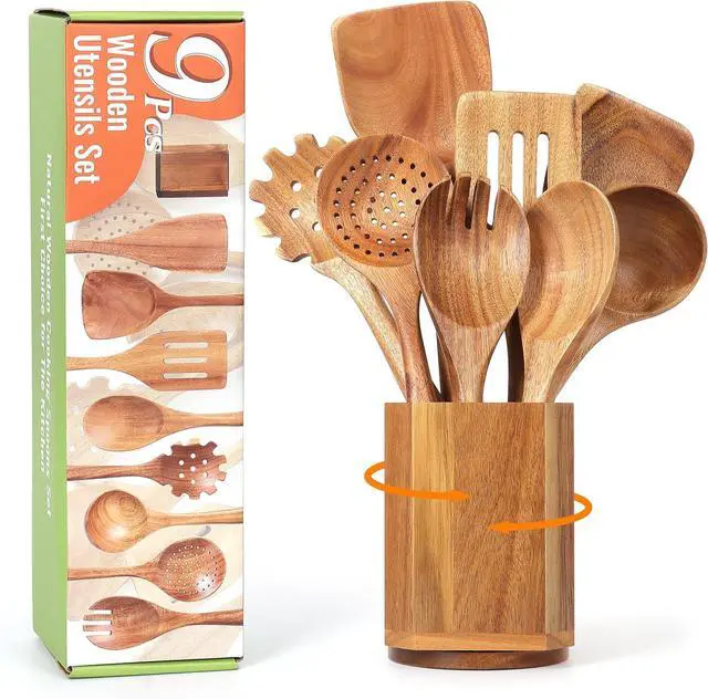 9-PCS WOODEN SPOON SETFrom stirring to serving, covering all your culinary needs, our 9-pcs wooden spoon set includes essential cooking tools like flat spatula, fried spatula, slotted spatula, strainer spoon, salad fork, mixing spoon, soup spoon, and a 360° rotating extra large cooking utensil holder for Countertop, which is deep and large enough to hold more than 15 cooking utensils, easily rotate for the right utensil and keeping your kitchen organized without taking a substantial amount of counter space.