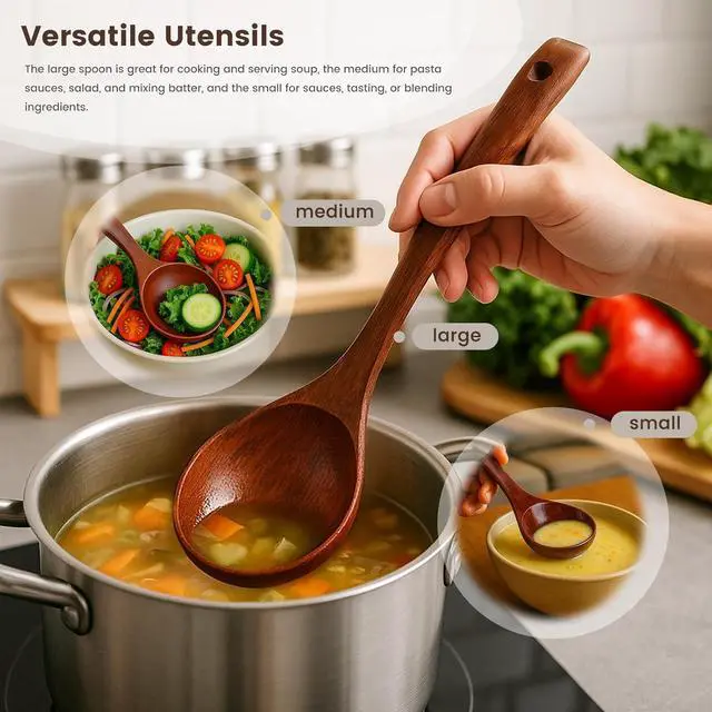 Versatile Utensils The large spoon is great for cooking and serving soup, the medium for pasta sauces, salad, and mixing batter, and the small for sauces, tasting, or blending ingredients. These wood spoons also make thoughtful gifts for housewarmings, holidays, or cooking enthusiasts