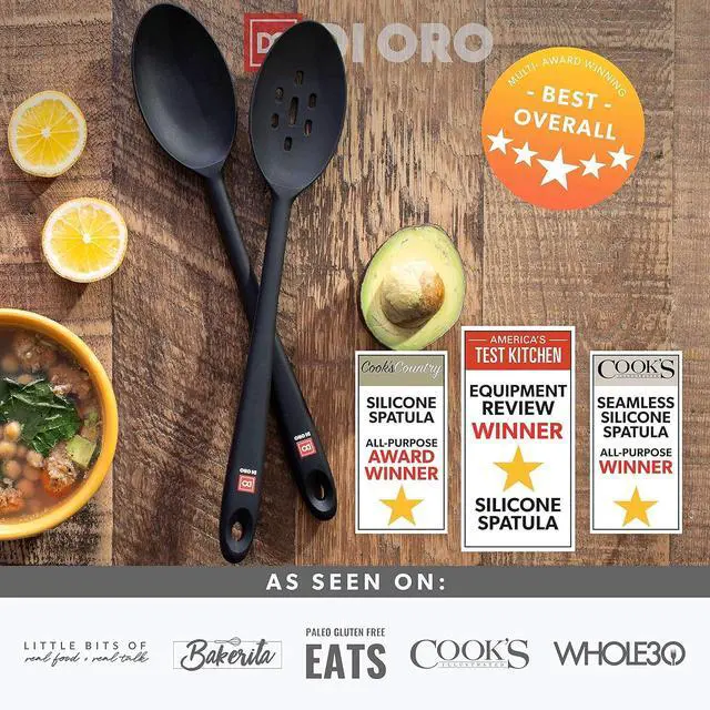 ONLY THE BEST By popular demand, we have added a solid spoon to our award-winning Seamless Series line of kitchen utensils. The DI ORO Seamless Series Solid Spoon is made with food grade, BPA Free, and LFGB Certified Silicone. Built to withstand the heat, this essential kitchen tool is heat-resistant up to 600°F, which means you will never melt your favorite spoon.