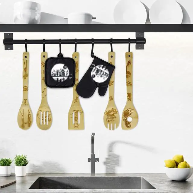 COMPLETE FUNCTIONALITY - It' s a very high-end bamboo cooking utensils set including one set of nightmare Wooden Cooking Spoons, one Oven Mitt 6.7 x 10.6 ", Potholder 7x7", and Apron 26.7 x 30.7 ". From flipping ingredients to serving a finished meal, experience the complete functionality of these premium wooden spoons for cooking.