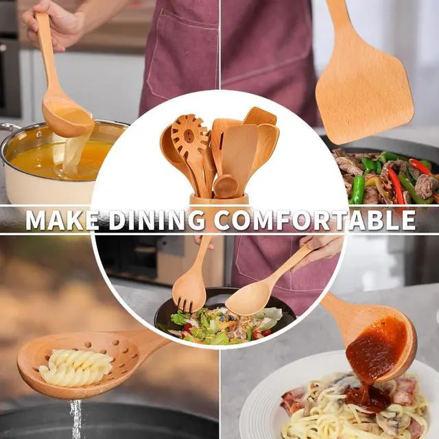 NATURAL Beech WOOD: Crafted from solid teak wood, our utensil set is 100% handmade and eco-friendly. It' s durable and crack-free, unlike silicone or bamboo alternatives.