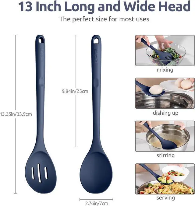 [ 13.35 Inch Long Seamless Integrated Design] The dishwasher safe mixing spoon with solid integrated design makes no crevices to catch food particles or dishwater. No breaking issue as there is no joint places. Its size is great for most mixing, stirring, serving, basting needs. The handle is long enough for most large pots without being too big to use at the table. Long length keeps your hand far from the heat, yet can still fit in your drawer for easy storage and can be hung for easy access.