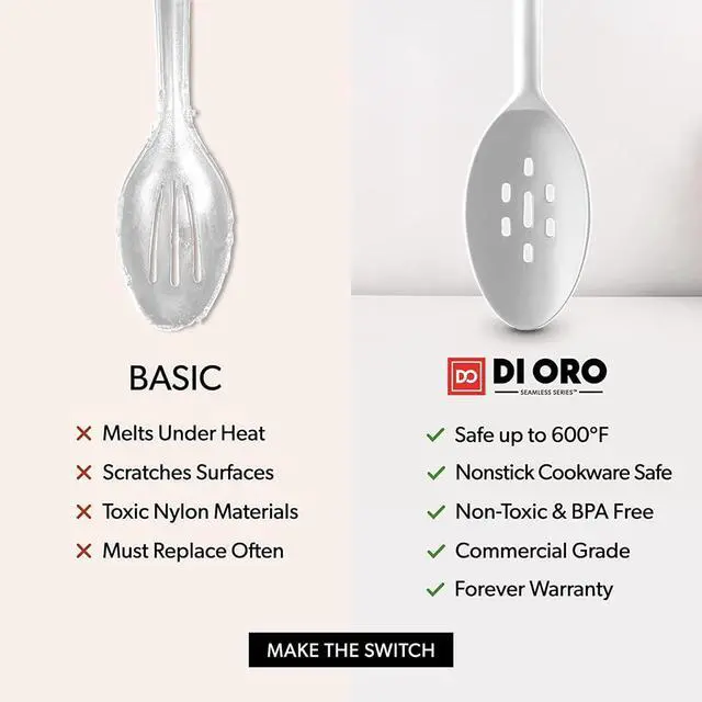 • ONLY THE BEST By popular demand, we have added a 2-Piece Silicone Spoon Set to our Award-Winning Seamless Series line of kitchen utensils. The DI ORO Seamless Series Slotted and Solid Spoons are made with food grade, BPA Free, and LFGB Certified Silicone. Built to withstand the heat, these essential kitchen tools are heat-resistant up to 600°F, which means you will never melt your favorite spoons.
