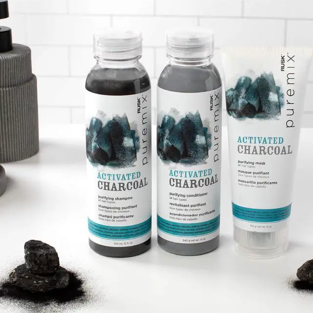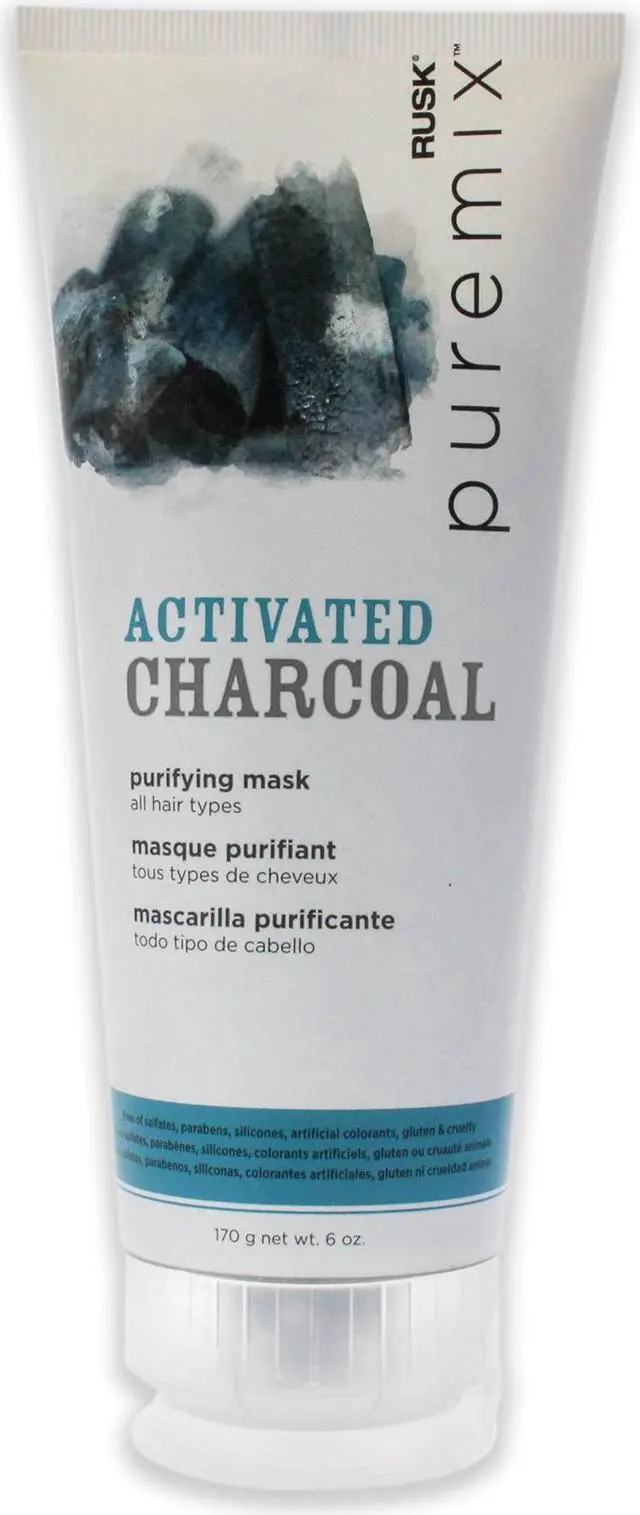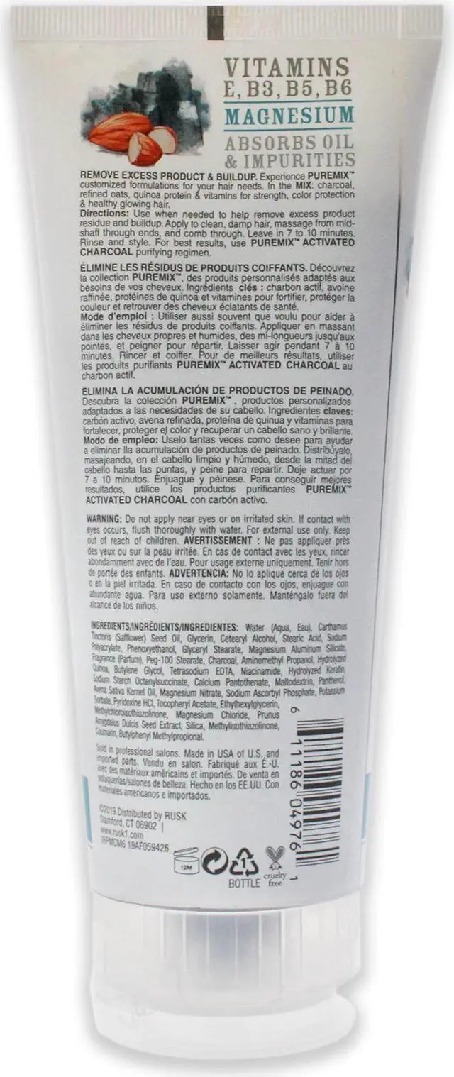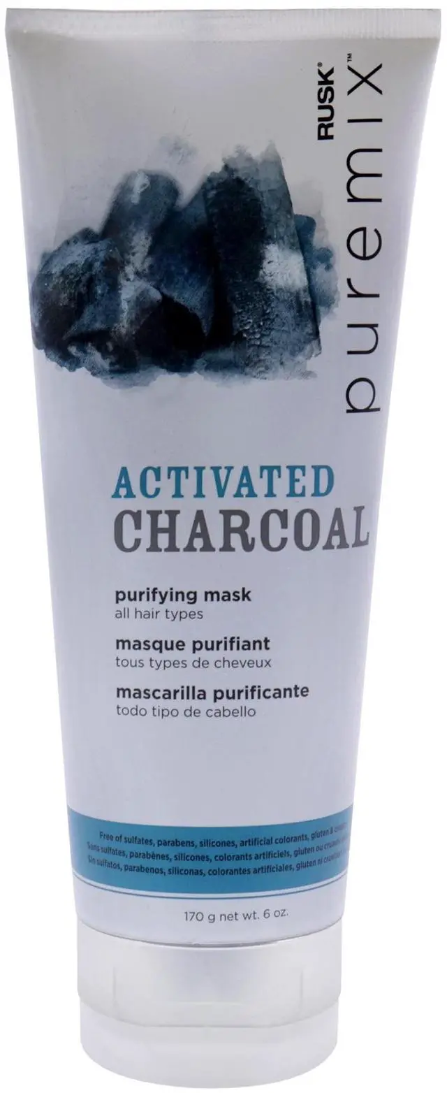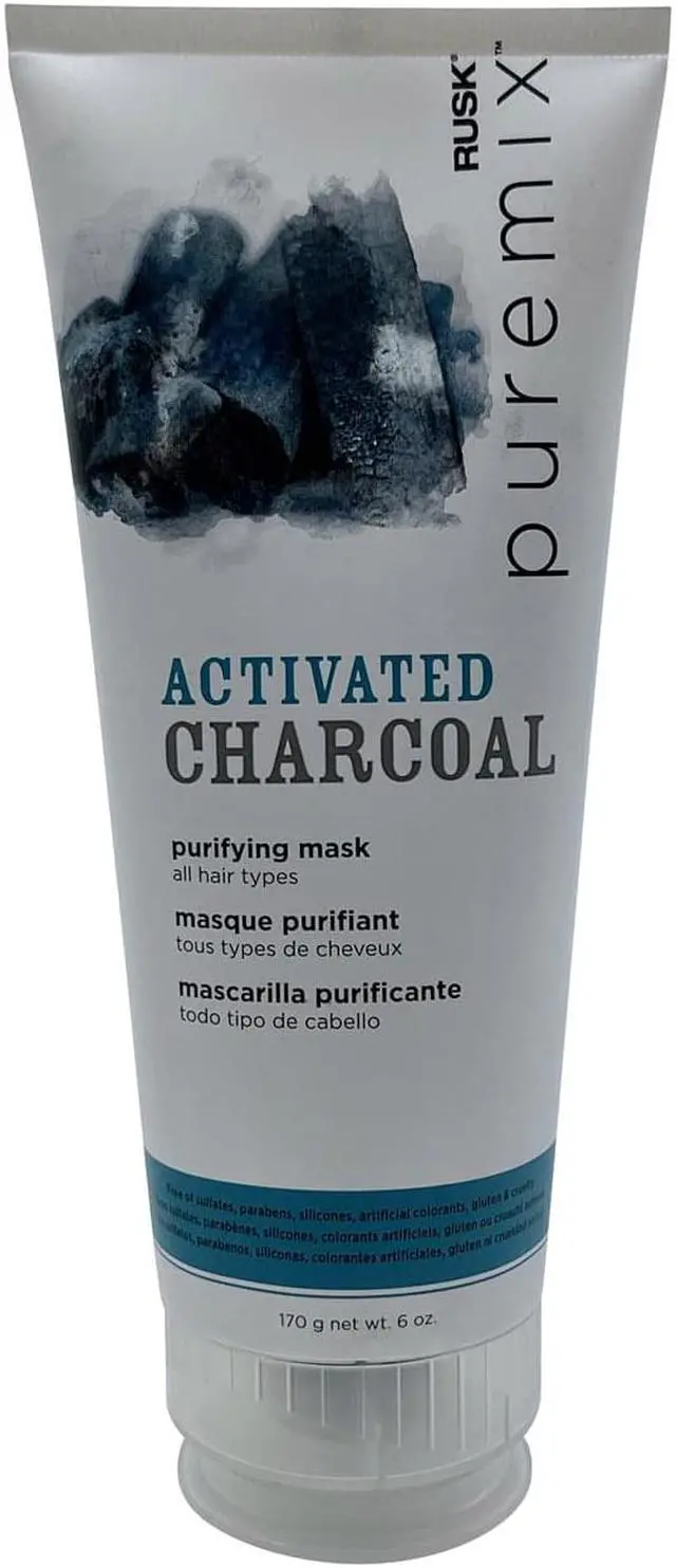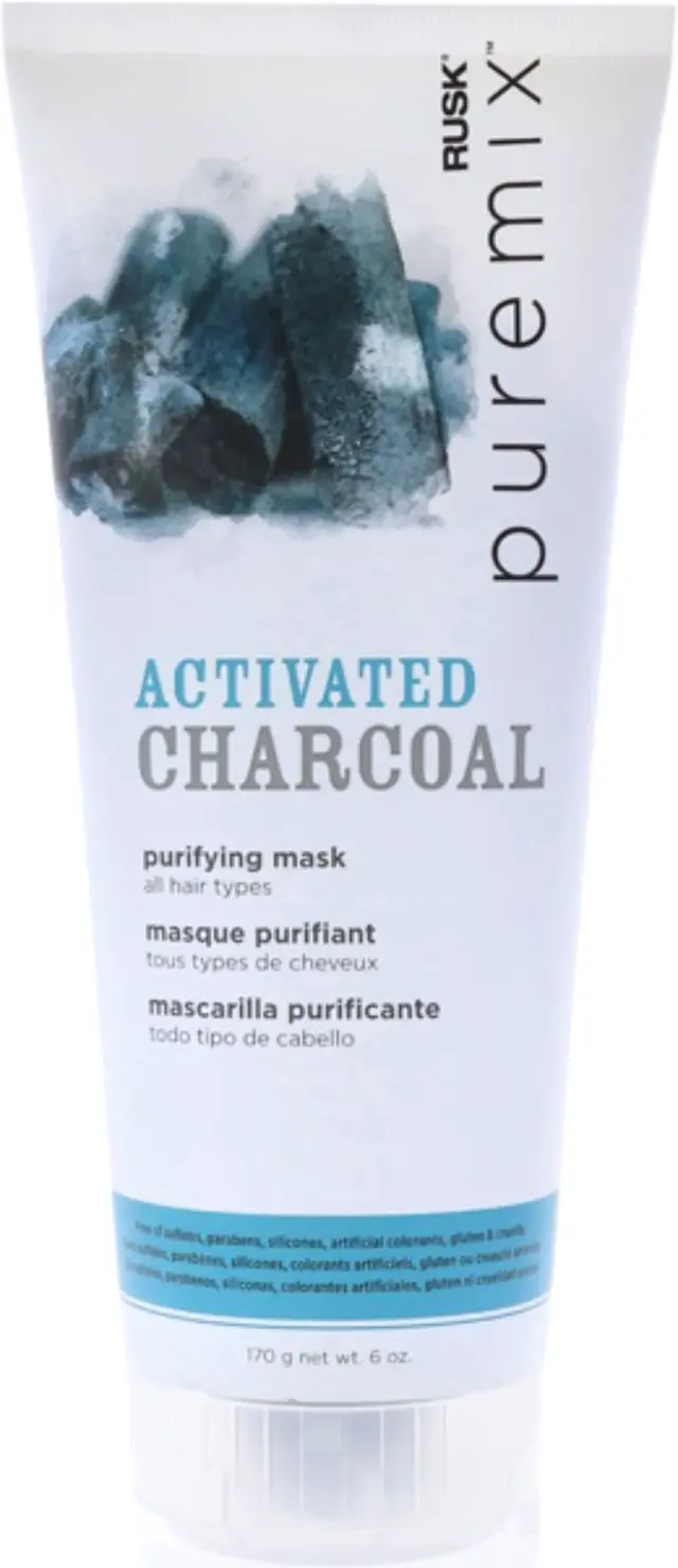 RUSK PUREMIX Activated Charcoal Purifying Mask for all hair types cleanses amp; purifies hair while gently moisturizing your strands. Formulated with vitamins E, B3, B5, B6 and magnesium to absorb oil, dirt, and gunk from your hair.